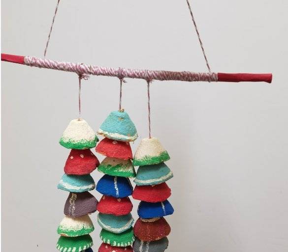 作品名称:轻物新生创作理念:以鸡蛋托为核心创作材料,经剪裁、上色后搭配木杆与绳线打造风铃形态,将废旧蛋托的肌理与明艳色彩相融。通过堆叠与悬挂的设计,让原本的包装废料拥有灵动的视觉效果,既实现了废旧材料的艺术再造,又以缤纷色彩赋予其童趣与活力,探索环保材料与手工创意结合的更多可能,也借此传递变废为宝的环保创作理念。