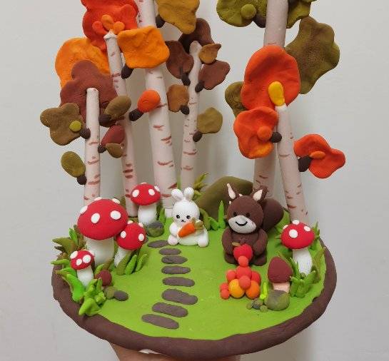 作品简介:森林里有白桦树,白兔,松鼠,蘑菇,利用废旧的纸壳以及彩色粘土制作的一幅秋日小森林,让我们一起去探索秋天的大自然,爱护自然吧!