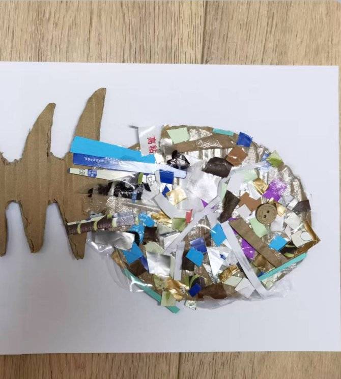 作品名称:《海洋里的生命》创作理念:以废旧纸板剪裁出鱼骨轮廓,搭配各类塑料、纸片边角料拼贴鱼身,将生活中的废旧材料进行艺术再造。通过硬朗的纸板骨骼与缤纷的废料肌理形成视觉对比,既还原了鱼的形态美感,又践行了变废为宝的环保理念,同时希望借此引发观者对废旧材料再利用的思考,感受环保创意与艺术表达结合的独特魅力。