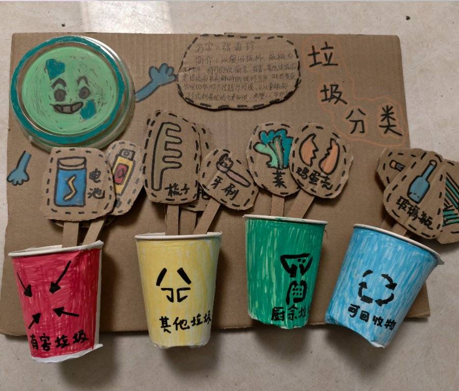 作品名称:垃圾分类创作理念:这幅垃圾分类手工作品的创作理念,以废旧纸杯、纸板、塑料盖为材料,将可回收、厨余、有害、其他四类垃圾用色彩鲜明的纸杯区分,搭配手绘垃圾图案的纸板装饰,既通过变废为宝的制作方式践行环保,又以童趣的视觉形式直观科普垃圾分类知识,让环保理念在手工创作中被感知、被传递,希望能唤起更多人从身边小事做起,参与垃圾分类,守护我们的生活环境。