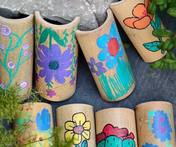 作品名称:竹筒春日重生创作理念:将闲置的竹筒作为创作载体,以鲜艳的颜料在竹面绘出花草与仙人掌的童趣图案,让原本普通的旧竹材脱离实用属性,转化为承载自然美学与创意的艺术摆件。通过色彩与图案的碰撞,赋予废旧竹制品全新的生命力,既呼应了环保再利用的理念,又以手绘的童趣笔触让自然材料与艺术创意相融,让旧物在画笔之下焕发新的光彩与温度。