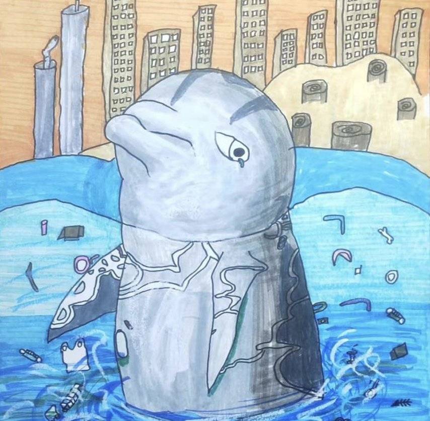 作品名:《它的眼泪》设计理念: 通过海豚含泪的双眼和身上的伤痕,直接传递痛苦的情感。背后冒烟的工业城市点明根源。作品用最直白的情感冲击,引发观者对污染受害者(而非抽象环境)的共情。