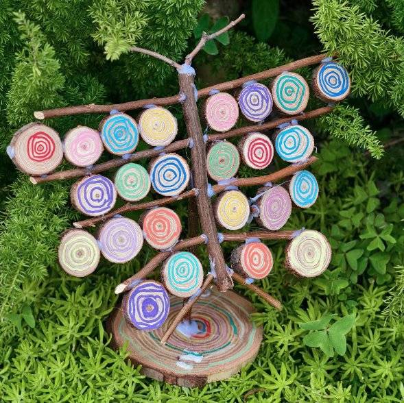 作品名称:《彩轮木树》创作理念:以自然掉落的木枝、木片为基底搭建树的形态,用多彩丝线缠绕出层层年轮,将人工的巧思与自然的本真相融,让平凡的自然材料在色彩的点缀下焕发新生,也借此表达对自然之美与手工创作结合的探索。