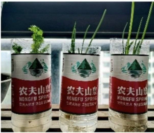 作品名称:废弃物回收小利用 设计理念:葱头香菜根+水瓶+白糖水,日常都是被丢弃的垃圾和废物,经过改造利用,可以再生出小葱和香菜。