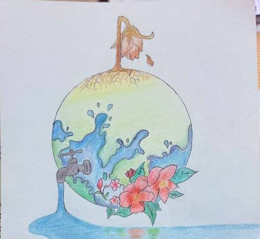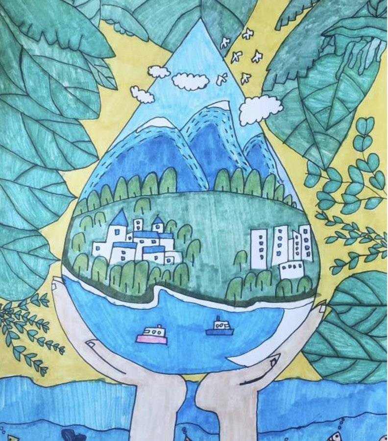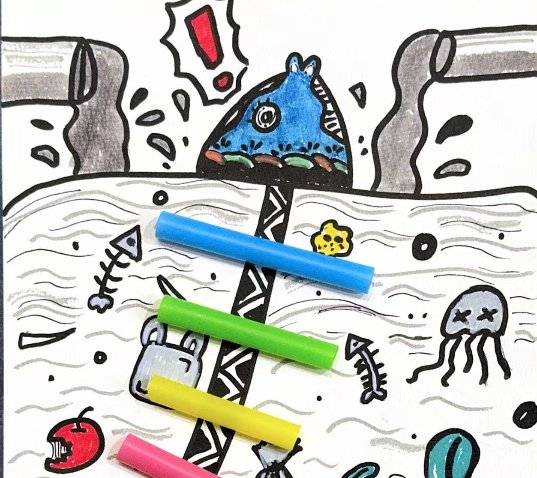 作品名称:小海洋的伤心眼泪创作理念:用童趣涂鸦绘海洋污染,借彩色笔管喻塑料危害,唤醒护海童心。