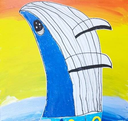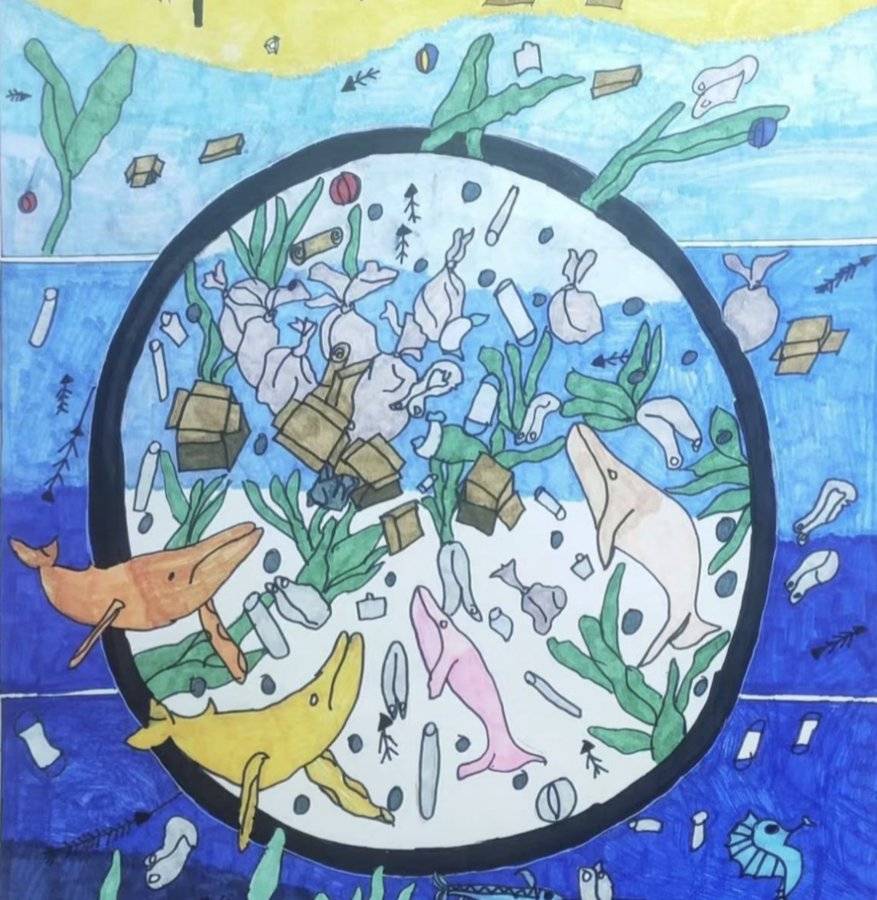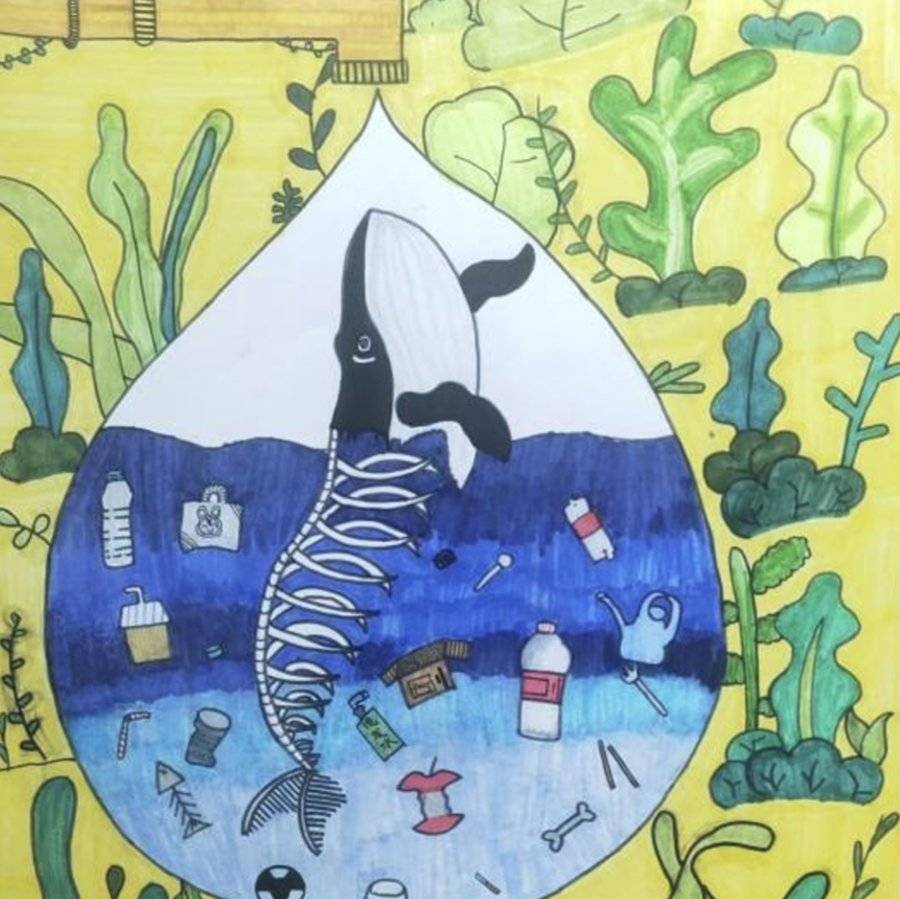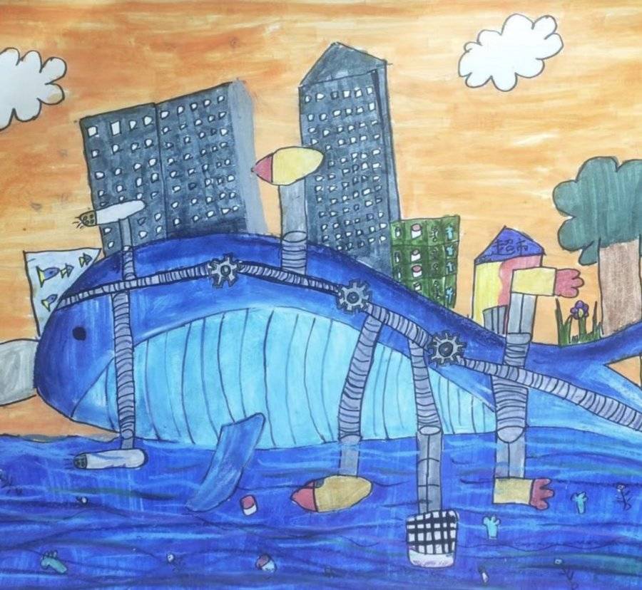 作品简介:作品将绘画与废物立体拼贴结合,用鲸鱼身陷海洋垃圾的画面,直观控诉海洋被污染的危害,呼吁大家保护海洋家园。
