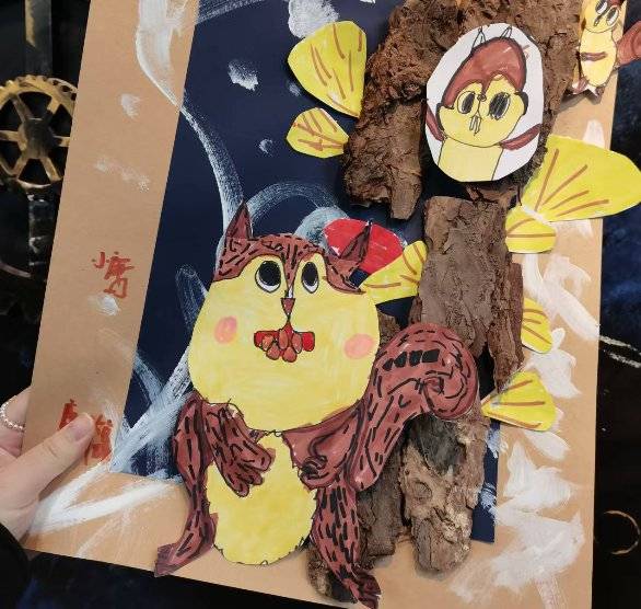 作品名称:松鼠跳跳的树屋创作理念:以自然树皮模拟森林树洞的肌理质感,搭配彩纸手绘与拼贴的方式塑造出憨态可掬的松鼠形象,将自然材料的质朴与彩色卡纸的活泼相融合,通过手绘的灵动线条和拼贴的立体层次,还原松鼠在林间树洞中灵动俏皮的模样,把森林里的童趣瞬间定格在画面里,让自然元素与手工创意碰撞出充满童真的艺术火花。