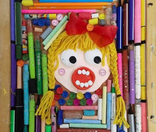 作品名称:彩笔童趣.旧物新生创作理念和简介:用废旧彩笔、纽扣、毛线等旧物拼贴创作,以童趣形象诠释环保与创意的融合。