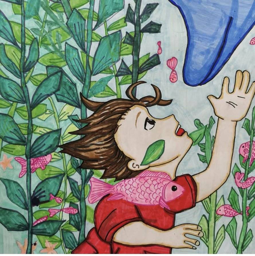 作品名:《海底密语》设计理念:以孩子伸手触摸海豚的瞬间为核心,构建了一个充满信任与好奇的跨物种对话场景。鲜艳的色彩与奇幻的水草背景,将深海转化为一个友好、开放的童话乐园,寓意人类与海洋生灵本应亲密无间。