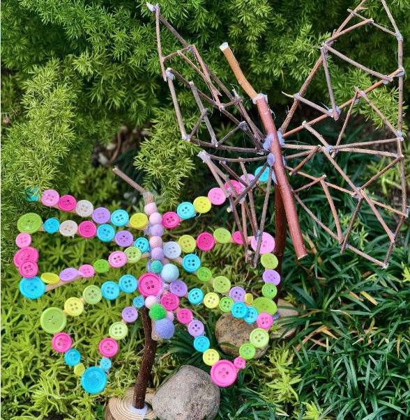 作品名称:《枝间彩蝶》创作理念:以枯枝搭建出蝴蝶的轮廓骨架,用五彩纽扣模拟蝶翅上的斑斓花纹,将自然材料与手工装饰结合,既保留枯枝的质朴质感,又通过纽扣的缤纷色彩赋予作品灵动的生命力,让孩子在创作中观察自然形态、发挥色彩想象,感受废旧材料再造的创意乐趣,也传递出自然与艺术相融的美好。