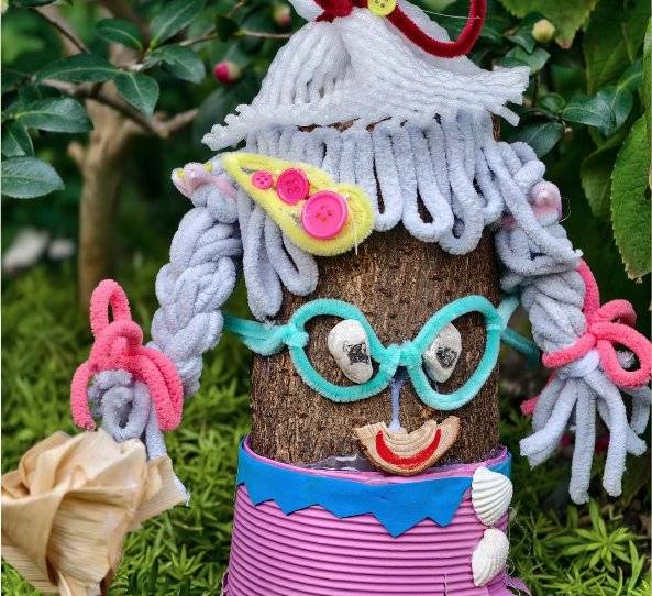 作品名称:木墩精灵创作理念:树桩为基,用纽扣、绒条、毛线等材料,赋予树桩童趣生命力