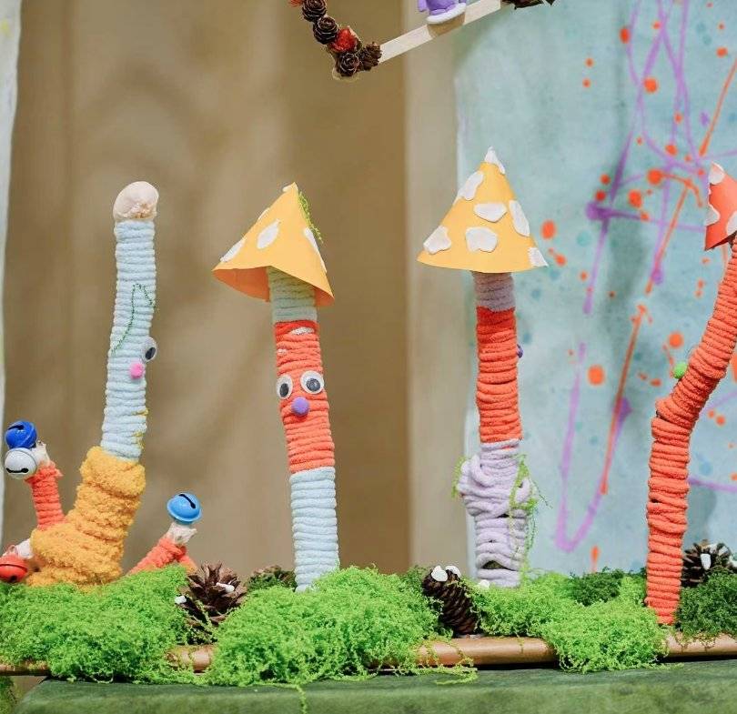 作品名称:蘑菇精灵的魔法森林创作理念:用彩绳、卡纸做蘑菇精灵,以童趣手工造奇幻森林,唤醒对自然的想象。