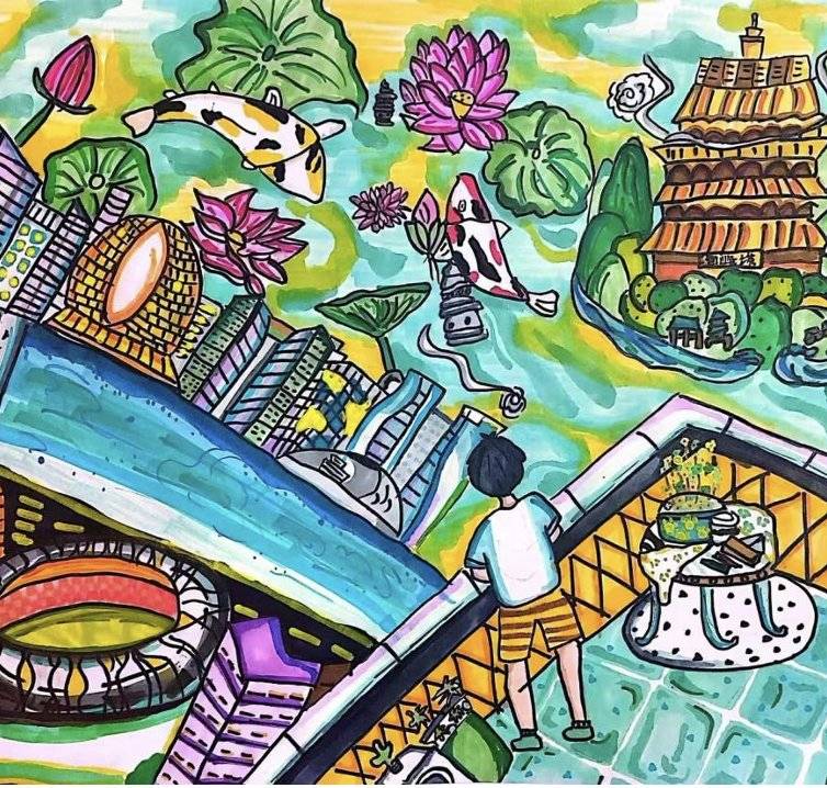 作品名:《都市水乐园》设计理念:将泳池、现代楼宇、锦鲤荷花与古塔并置,打破时空与自然人文的界限。画面以高饱和度色彩和超现实构图,描绘了一座充满活力的未来亲水都市,体现了人类生活与水生生态的融合共生。
