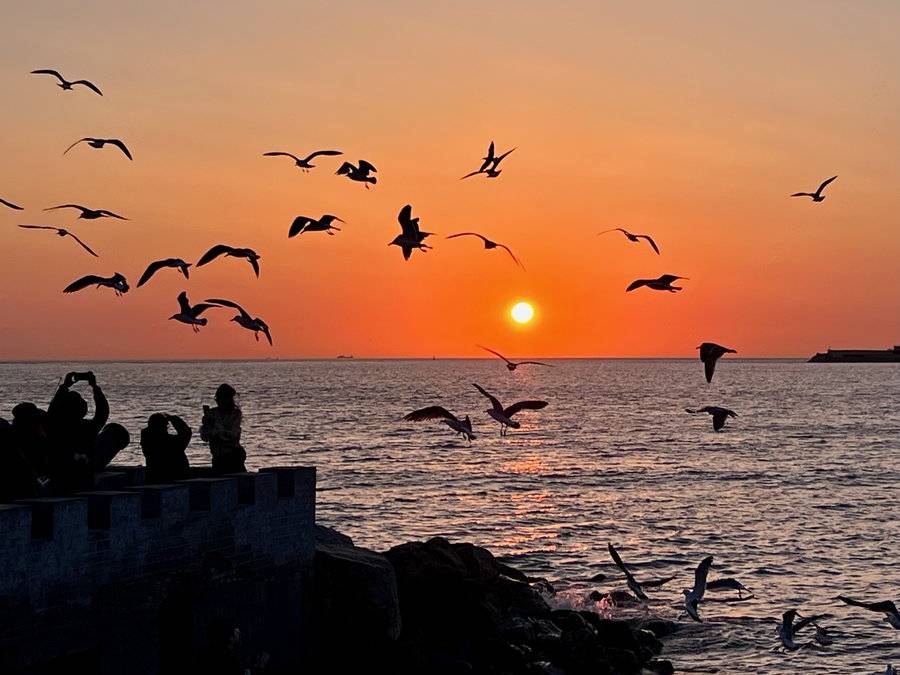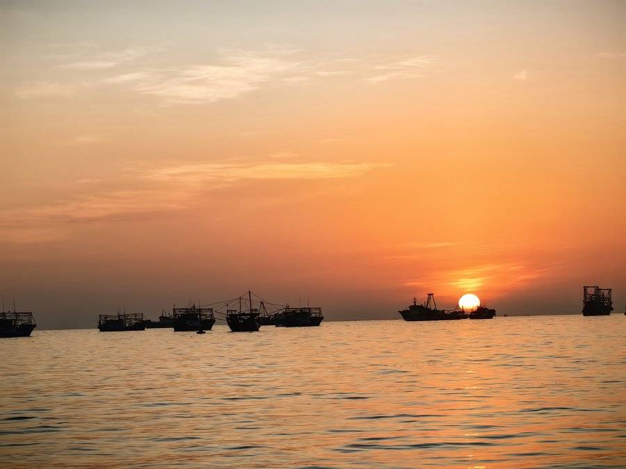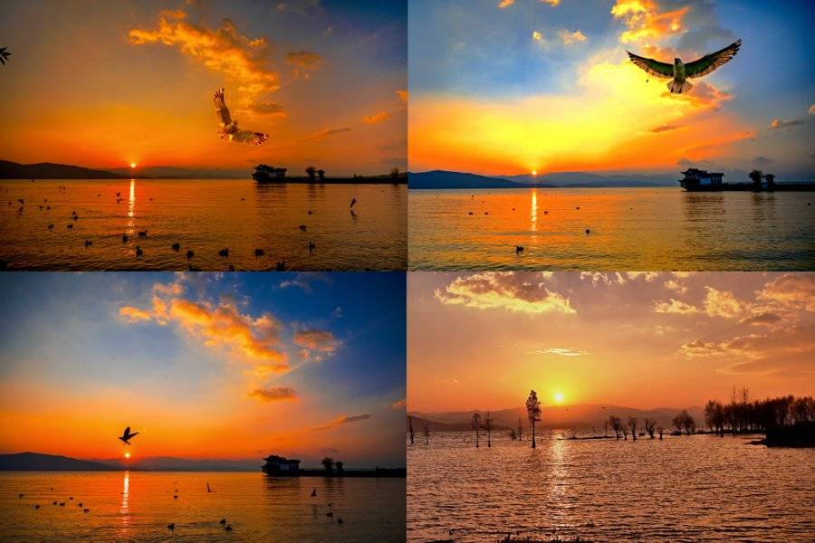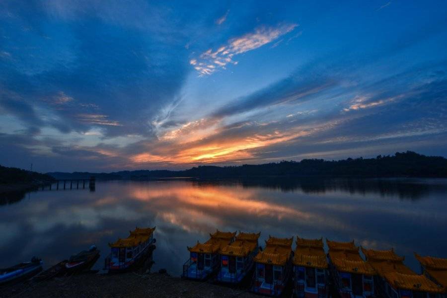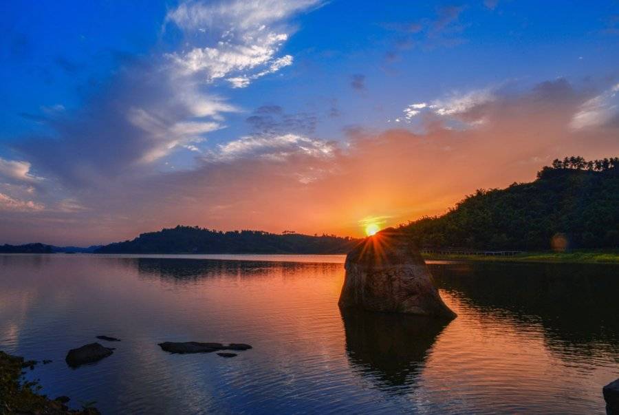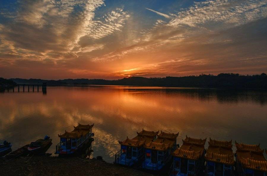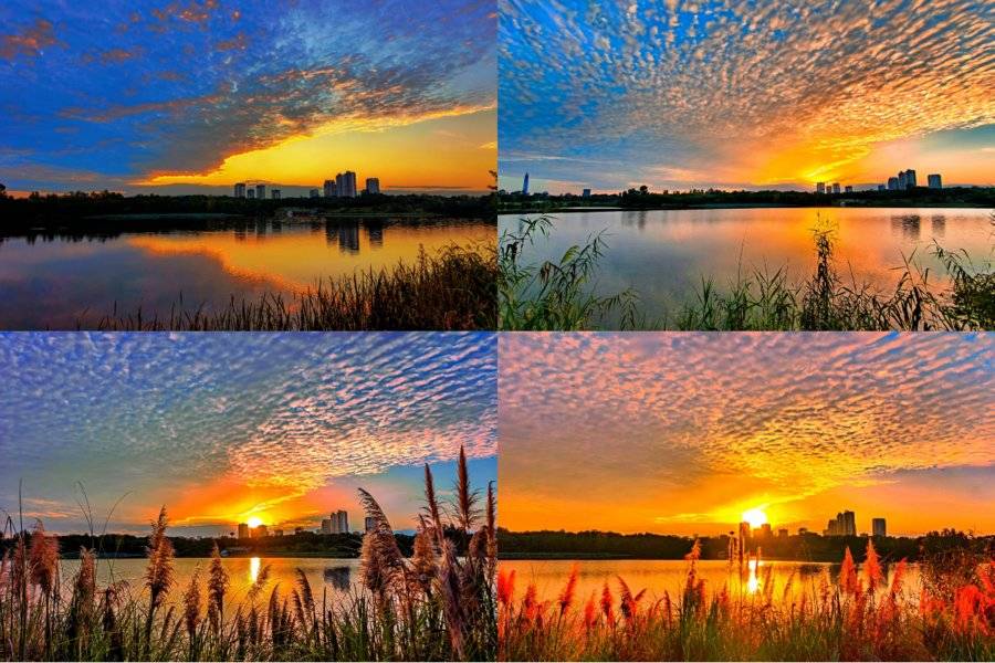 云霞如焰,从蓝紫渐变至金橙,岸边芦苇草在晚风里摇曳。