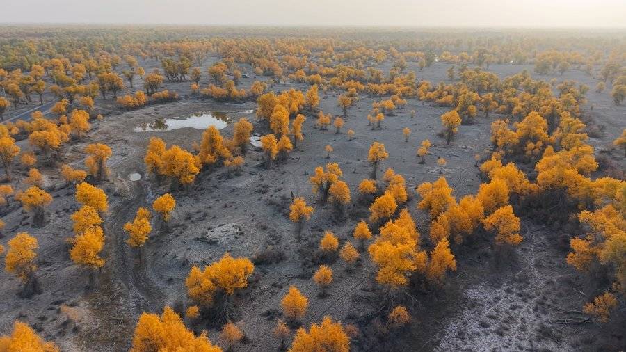 在新疆沙雅的土地上,胡杨如金色的火焰在戈壁间燃烧,枯寂的大地因它们的存在而充满生命在绝境中迸发的张力。