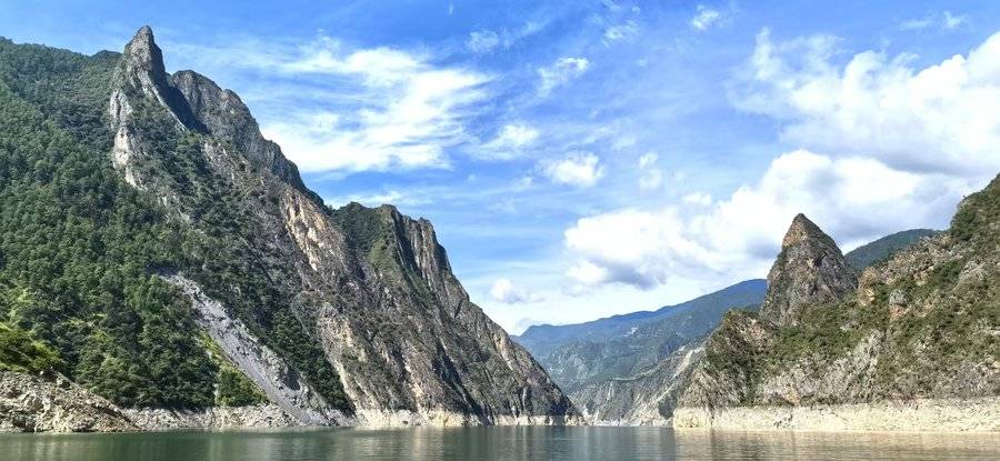 锦屏库区V型峡谷,壁立千仞,岩骨叠翠,碧水映蓝天。