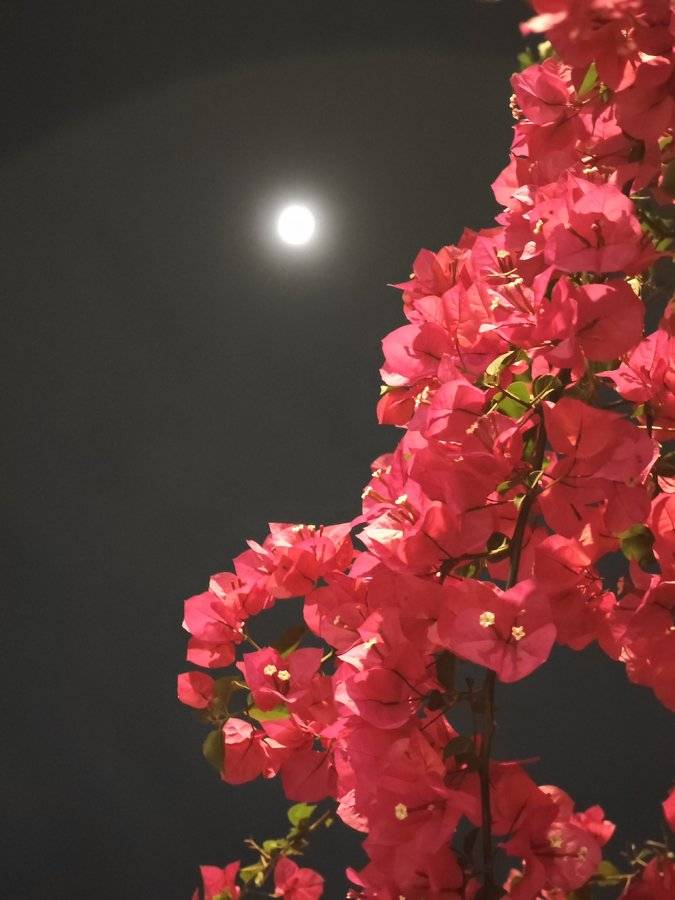 皎洁月光下,鲜艳的三角梅绽放,光影交错,静谧而生动,展现自然之美。