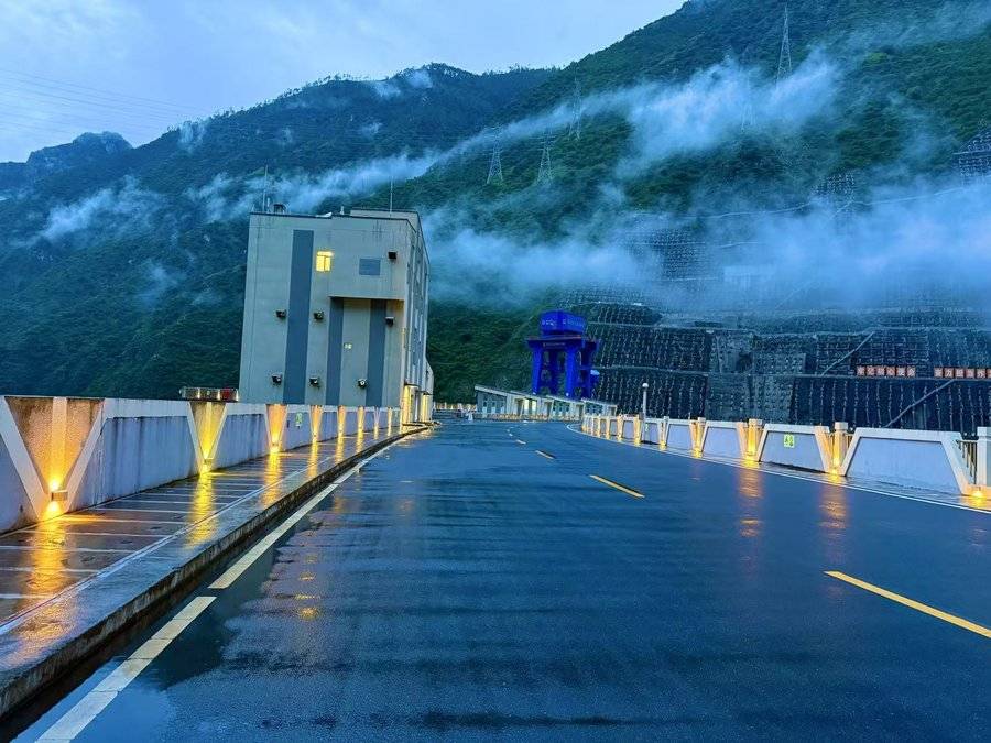 傍晚时分,世界最高双曲拱坝在云雾缭绕的山峦间明灯璀璨,尽显工程雄伟与自然交融之美。
