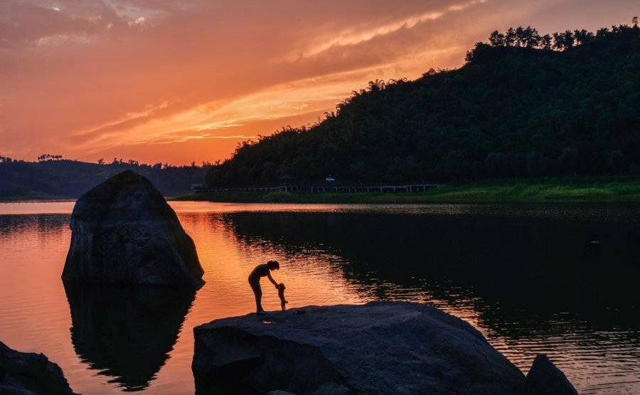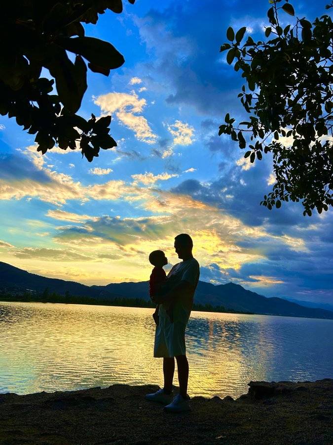 远处的山峦与湖面旁,夕阳下父子相依的温馨时刻。
