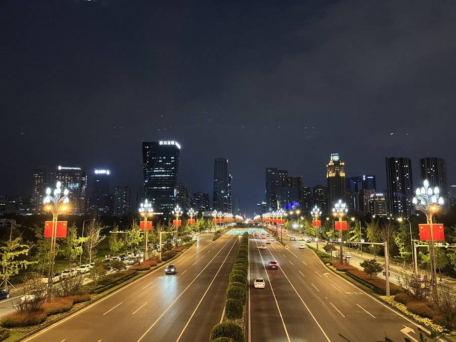 国庆佳节时,天府大道华灯幻彩流金,国旗飘舞,蓉城璀璨颂祖国荣兴!
