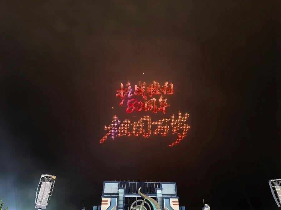 国庆期间在自贡方特观看无人机表演,无人机组成“祖国万岁”等字样,振奋人心。
