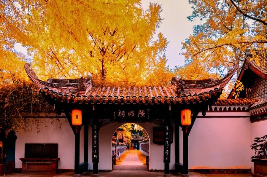 满树银杏铺陈天际,一条小径蜿蜒向深。