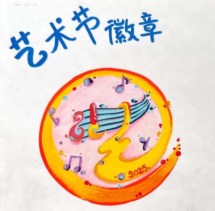 设计理念 这是2025艺术节的超萌徽章!圆圆的彩虹边框像糖霜,里面的“艺”字会扭扭腰跳舞,音符们像小跳跳糖,彩色点点是眨眼睛的星星!它就是艺术节的魔法邀请卡,一看就知道要一起玩超有趣的画画、唱歌、游戏啦!