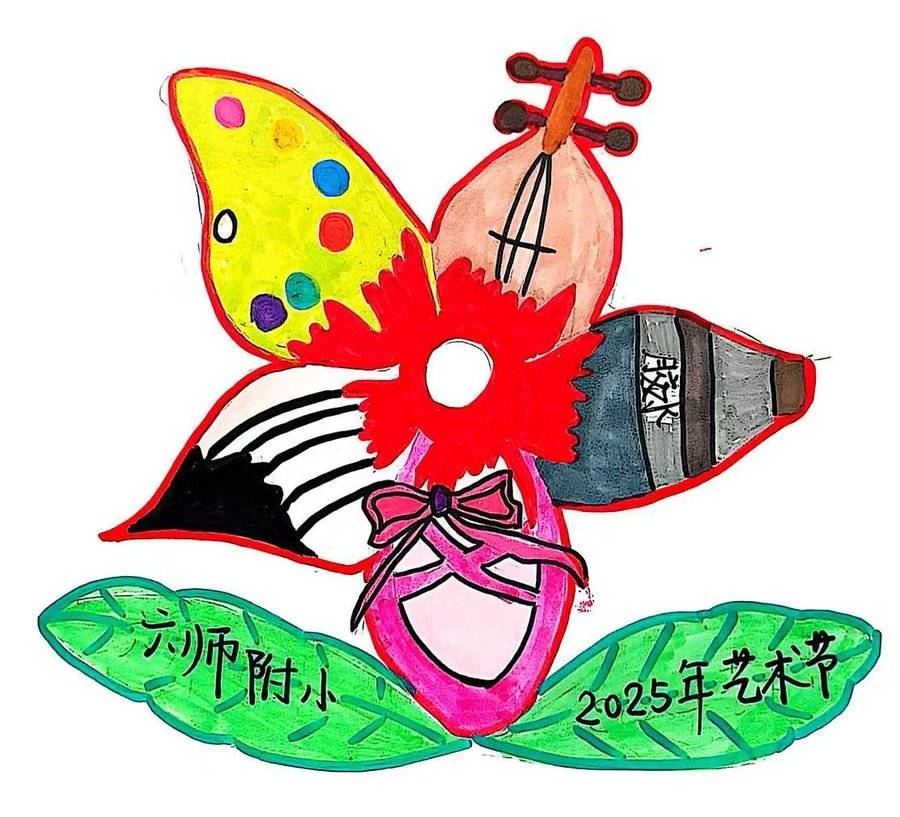 设计理念 五片花辨分别代表画画、首乐、手工、跳舞、书法。中心采用剪纸手法把五种艺术结合在一起。通过六师附小2025年艺术节绿叶平台,衬托出小朋们心中艺术之花的绽放。