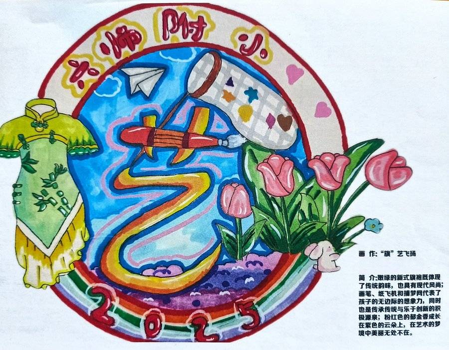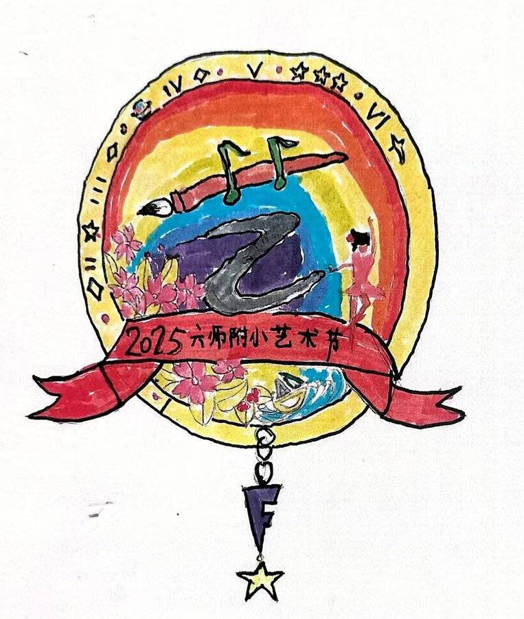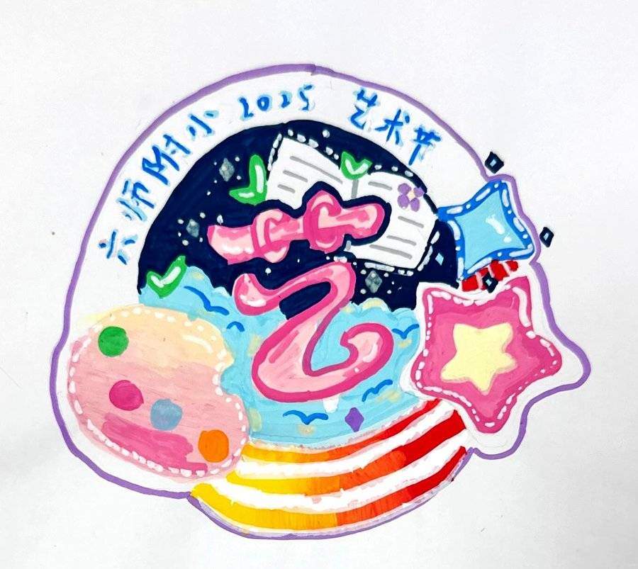 设计理念 以圆形为基底,外围用一圈黄色上面有数字1~6代表六师的六,星星和星球代表科技和创新。背最主体是彩色画笔勾勒的彩虹与花朵,"艺”字是用毛笔代表传统艺术,音符是艺术旋律,丝带寓意我们在艺术殿堂然起舞。徽章颜色鲜艳活泼,有小学生般朝气。整体设计想表达:我们用创意绽放快乐,用艺术展现自我。