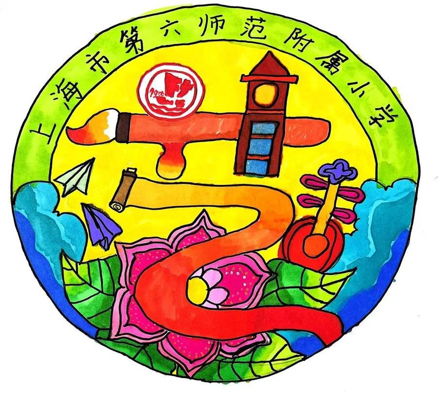 设计理念 以“童心绘梦,艺彩未来"为主题。以"六师附小"的"六"为灵感,徽章主题是一支像彩虹一样的大画笔。这个大"六”还会变身呢——它绕着一个圆圆的风车转啊转,风车的六片叶子就是我们学艺术的六个魔法:用眼睛看、用小手画、用脑袋想、学老师的本领、和同学们一起合作,还有做最疯