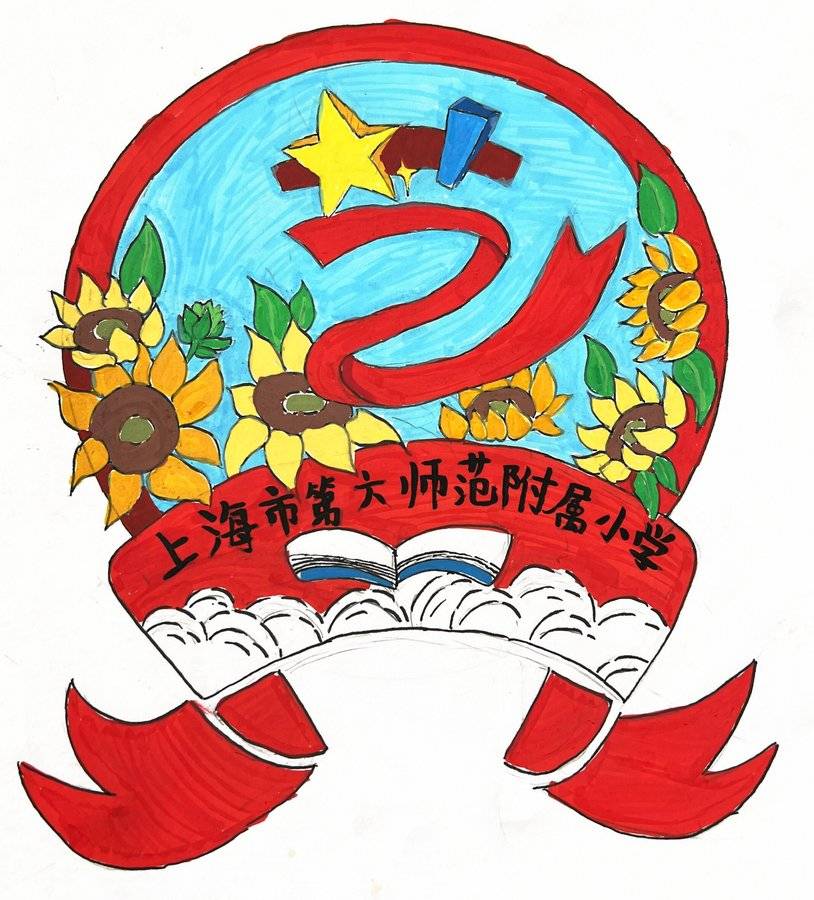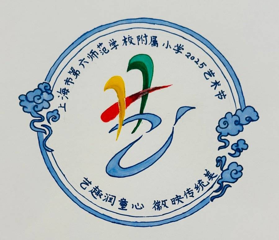 设计理念 这幅徽章以上海第六师范附属小学为设计主体,红色圆环象征团结,内部蓝色背景寓意广阔天空,黄色星星象征希望,蓝色书本体现知识传承。向日葵向阳而生,寓意学生在阳光教育下健康成长,绿叶代表生机,下方云朵和飘带增添灵动,整体传达出学校培育向阳少年、助力学子在知识天空中扬帆成长的理念,也展现了艺术节的活力与校园文化的融合。