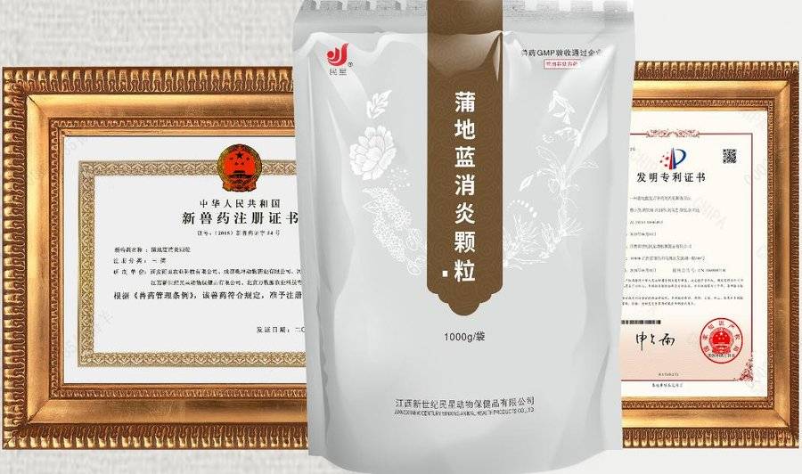 国家三类新兽药,国家专利工艺技术 1、民星蒲地蓝消炎颗粒的组方(与人药一致):蒲公英、黄芩、板蓝根、 苦地丁2、工艺创新:人用药工艺流程,复方精提,坚持“复方”的制药理念, 但绝不是指把几味药放在一起混合煎煮 3、湿法制粒:溶解性好,静置无沉淀,水线不易形成生物膜,颗粒成型 好,流动性好、不易结块4、高企业标准:增加告依春、咖啡酸、紫堇灵的含量控制