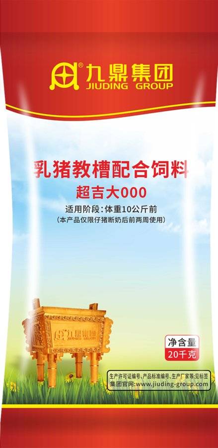 “超吉大000”教槽料,是九鼎集团技术团队整合多年的研发成果,经过猪场的不断验证实践,开发出的一款优质产品。“超吉大000”教槽料融合了三项九鼎专利技术(ZL201410224836.X,CN201310024849.8,ZL201410275976.X)。产品设计初衷是满足仔猪爱吃、不拉稀的需求。一款好的教槽料,诱食是最重要的,仔猪断奶后吃母猪奶水直接过渡到吃固体饲