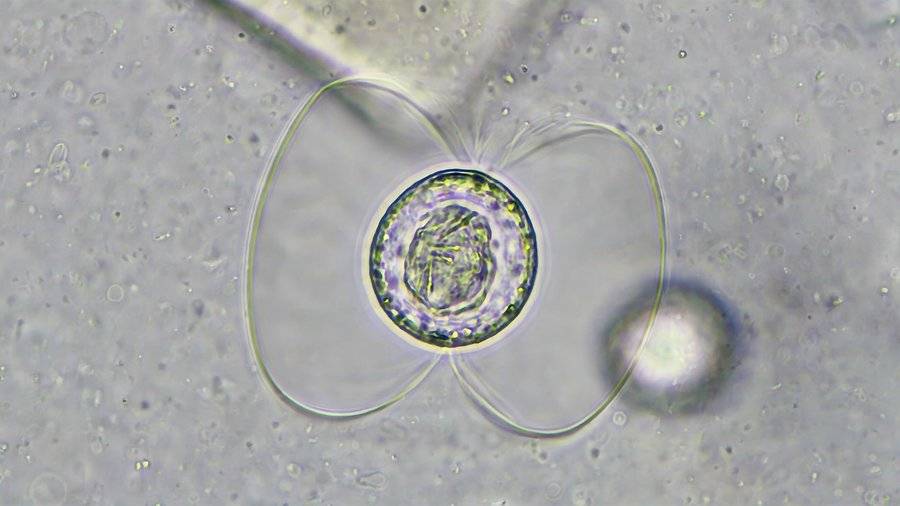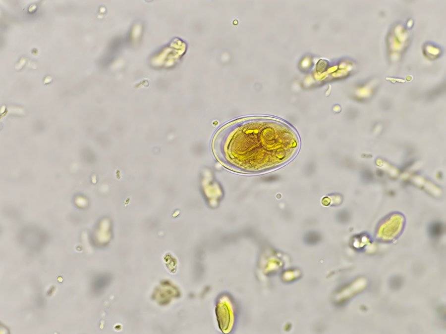 蛲虫卵呈现一种不对称的美学,一侧较平,一侧微凸,像一颗饱满的D形芸豆。透明厚实的双层卵壳内,常常可见发育中的幼虫蜷缩其中。它如同一个晶莹的育儿囊,在微观世界中静待生命的绽放。