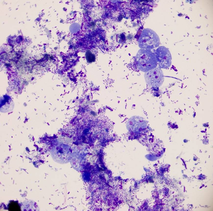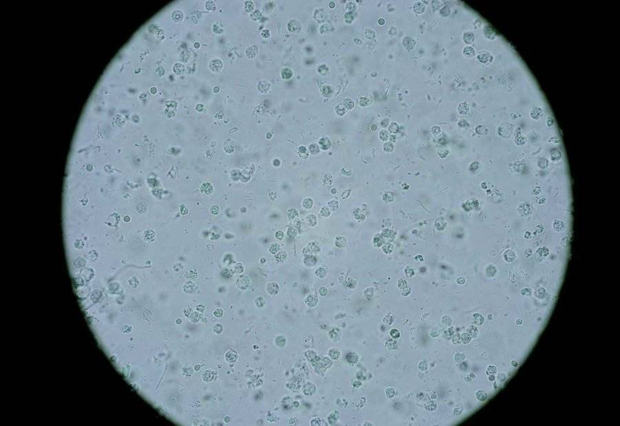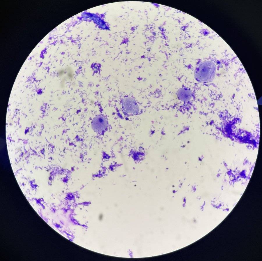 人芽囊原虫在常规镜检中易隐匿与白细胞混淆,难以辨识。经瑞氏染色处理后,其类圆形虫体清晰显现,中央大空泡与周缘细胞核的独特结构一目了然,胞浆细节尽数呈现。这抹染色后显露的微观身影,为该虫的精准检出提供了关键依据,尽显镜下染色技术的精妙与微观生命的隐秘之美。