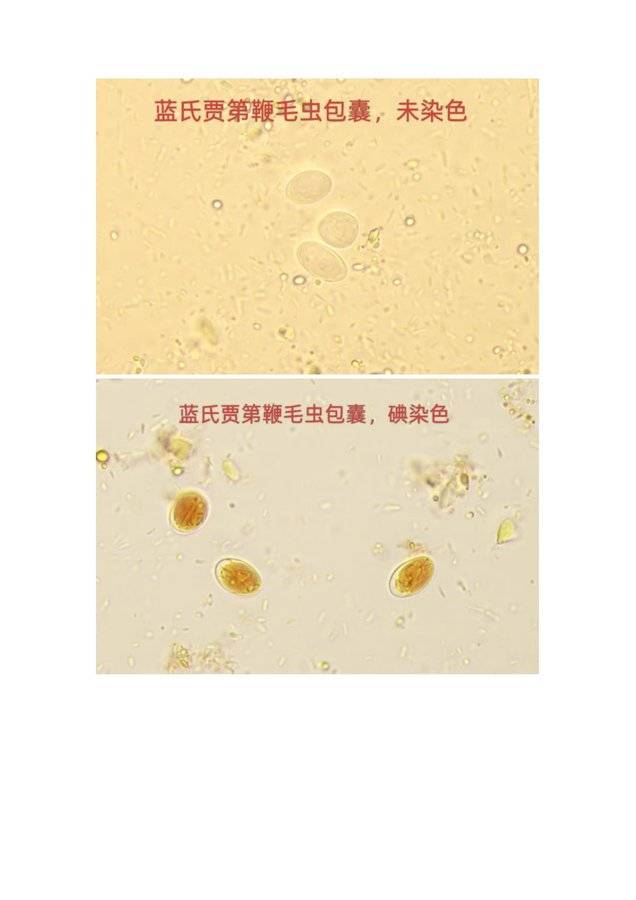 包囊呈椭圆形,长为8~14um,宽7~10um。囊壁较厚,与虫体间有明显的间隙。碘液染色后呈棕黄色,未成熟包囊内含2个细胞核,成熟包囊有4个核,多偏于一端。囊内可见鞭毛、丝状物及轴柱等。