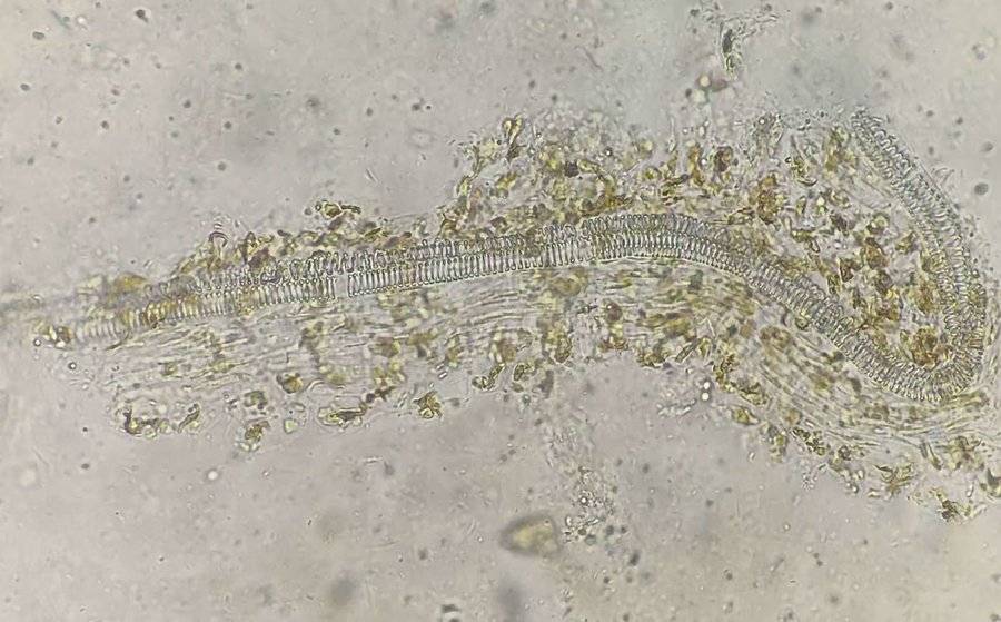环纹导管程连续梯状—这些未消残体,正是消化道里藏着的微观“植物化石”。高倍镜下取自身粪便的生理性植物细胞结构,未染色。
