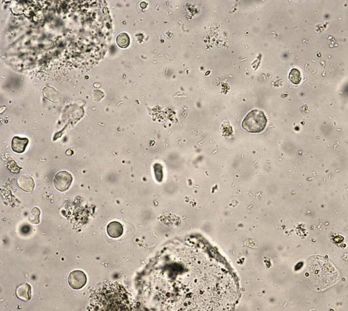 结肠内阿米巴包囊直径10-30微米,多为15-25微米。多呈圆形,有时呈不规则形。核一般为2个、4个、8个,偶见16个和32个,看到有5个或5个以上核的包囊一般就可以判定为结肠内阿米巴;8个及以上数量核的包囊为成熟包囊,可根据核的数量直接判断为结肠内阿米巴包囊;4个及以下数量的包囊为未成熟包囊,这时核的数量不具有特异性,尚需与其它阿米巴包囊鉴别。结肠内阿米巴包囊碘染色后包囊呈淡黄