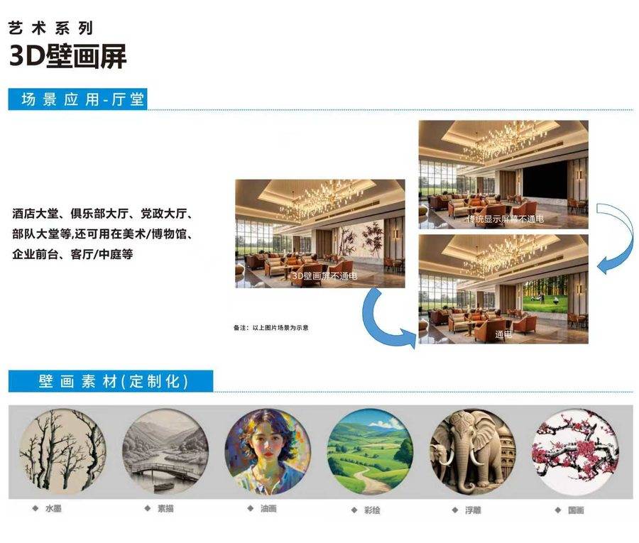 我正在参加年度创新产品明星奖评选LEOX建业显仕专注于LED全彩显示屏、高清LCD专业显示屏、透明OLED创意显示屏及图像处理系统产品的研发、生产与服务,以科技创新和用心服务为支撑,为客户打造专业全域显示解决方案,拥有完备产品线与技术服务体系。 LEOX建业显仕的3D壁画屏是一款将科技与艺术完美融合的创新产品。它突破了传统显示屏的功能边界,实现了“熄屏即艺术,亮屏即视界”的独特体